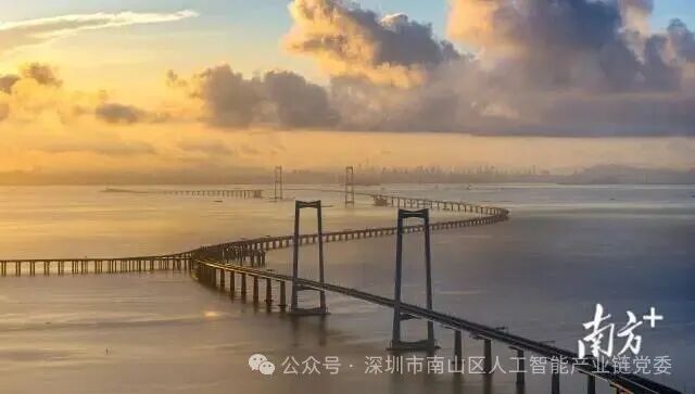 朝阳照射在深中通道上,勾勒出远处城市群的轮廓。