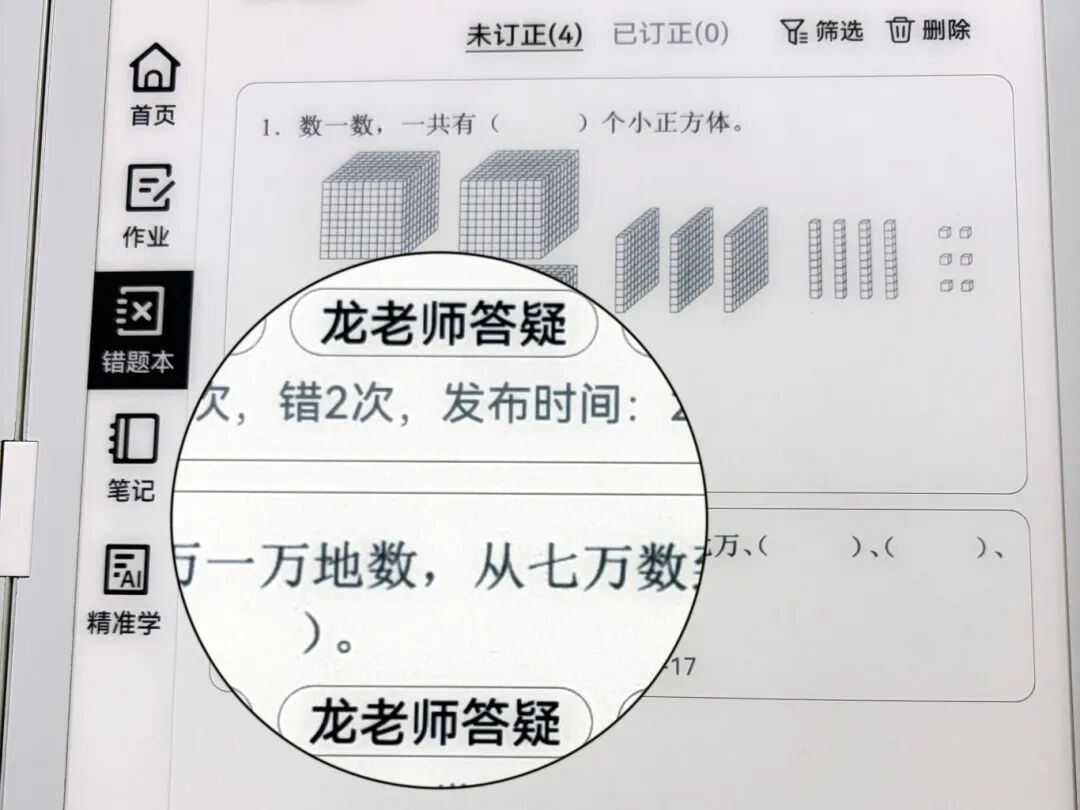 龙城高级中学(教育集团)龙城初级中学七年级已在语数英等学科,开展墨水屏学练机试点应用。该校数学教师刘老师介绍学校正积极探索混班教学场景,课堂上教师通过设备,为学生精准推送基础习题,及举一反三类练习,学生作答后即时提交,系统可快速统计错题率,教师则针对高频共性错题,进行集中讲解,大幅提升了课堂教学效率。